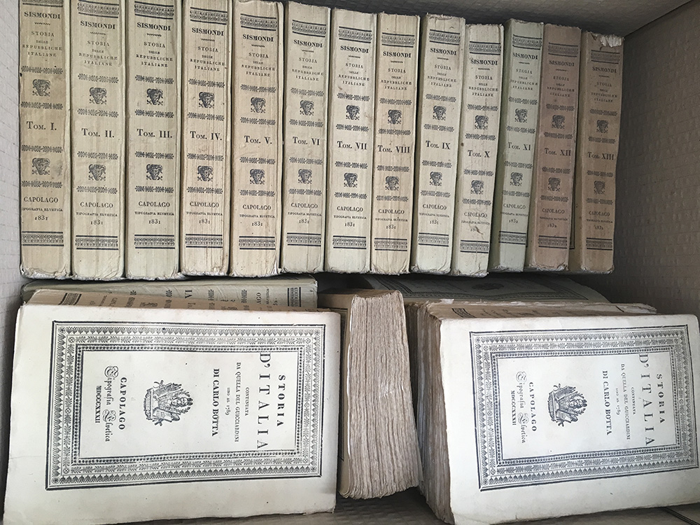 BOTTA, Carlo. Storia d'Italia continuata da quella del Guicciardini sino al 1789. Capolago: Tipografia Elvetica, 1832-37. 8 volumi in 8vo, brossura editoriale stampata in nero. [SI AGGIUNGE:] SISMONDI, Sismondo. Storia delle Rrepubbliche Italiane. Capolago: Tipografia Elvetica, 1831. 16 volumi, Brossure uniformi. Non collazionato e difetti da esaminare.