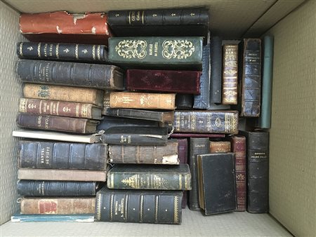 [BREVIARI] 2 cartoni contenenti numerosi breviari e libri di preghiere in bella legatura del secolo XIX. Non collazionato e difetti da esaminare.