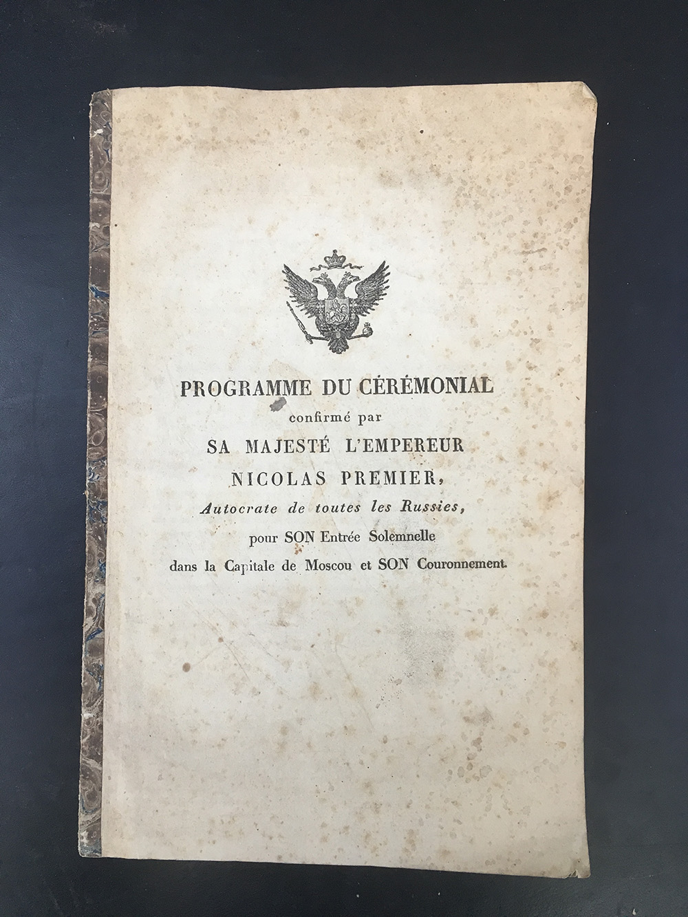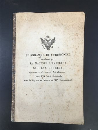 [CERIMONIE] Programme du cérémonial confirmé par sa Majesté l'Empereur Nicolas Premier...pour son Couronnement, Mosca: Semen, 1825. Folio, stemma della casa reale russa al frontespizio. Dorso in carta marmorizzata, privo di piatti. Interessante pandetta che descrive in dettaglio l'incoronazione di Nicola I. Non collazionato e difetti da esaminare.