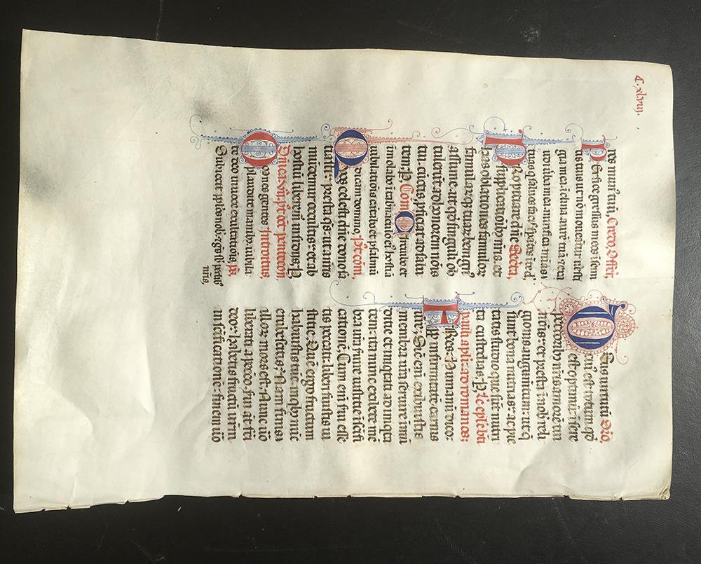 Foglio di pergamena manoscritto al fronte e al verso con alcune iniziali rubricate in rosso blu, azzurro. Ca. XV secolo
