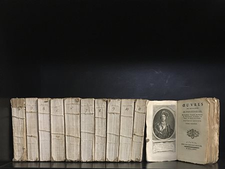 FONTENELLE, Bernard Le Bovier de. Oeuvres...Nouvelle édition. Parigi: Libraires associes, 1766. 8vo, 11 vol, antiporte figurate ad ogni volume. Legatura coeva in carta stampata, esemplare in barbe (difetti). Non collazionato e difetti da esaminare.