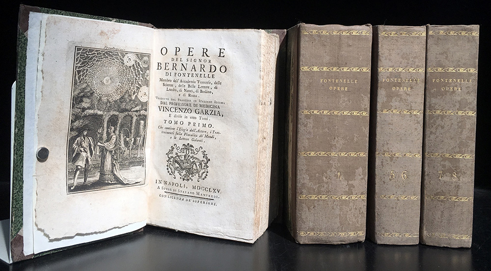 FONTENELLE, Bernard Le Bovier de. Opere del signor Bernardo di Fontenelle; membro dell'Accademia Francese , delle scienze, delle belle lettere, di Londra, di Nanci, di Berlino, e di Roma. Napoli: Stefano Manfredi , 1765. 8 tomi in 4 volumi, bell'antiporta incisa in rame. Mezza tela posteriore, dorso decorato in oro. Non collazionato e difetti da esaminare.