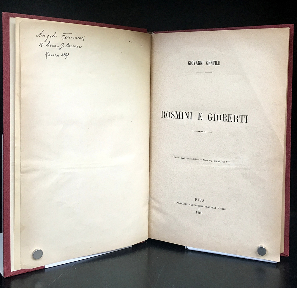 GENTILE G. Rosmini e Gioberti. Pisa: Nistri, 1898. 8vo, Legatura in tutta...