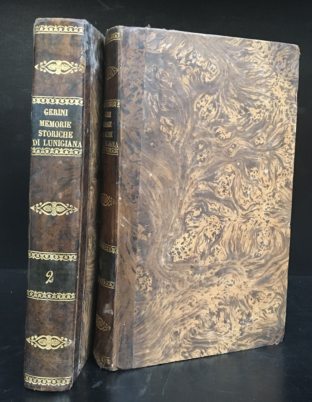 GERINI, E. Memorie storiche d'illustri scrittori e di uomini insigni dell'antica e moderna Lunigiana. Massa: Luigi Frediani, 1829. 2 volumi in 8vo, mezza pelle coeva, piatti marmorizzati. Non collazionato e difetti da esaminare.