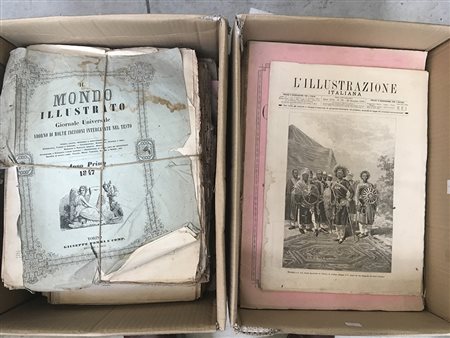 [GIORNALI ILLUSTRATI]. Due cartoni contenenti numerose annate di vari giornali illustrati del XIX secolo fra cui Il Mondo Illustrato (anno I), Emporio Pittoresco, Illustrazione Italiana e La Tribuna Illustrata. Non collazionato e difetti da esaminare.