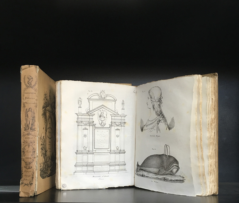 Magazzino Pittorico Universale 1834. Genova: Ponthenier, 1834-35. 2 voll folio. Numerose illustrazioni nel testo e tavole a piena pagina. Legatura editoriale coeva in cartonato stampato (difetti). Due annate di questo settimanale di curiosità e notizie illustrato. Non collazionato e difetti da esaminare.