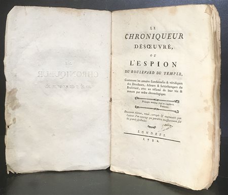 MAYERU F. M. Le Chroniqueur désoeuvré, ou l'espion du boulevard du Temple. Londra, s.e, 1782. 8vo, brossura coeva. Raccolta di recensioni e aneddoti dai toni satirici su teatri, circhi e fenomeni da baraccone di Parigi. Non collazionato e difetti da esaminare.