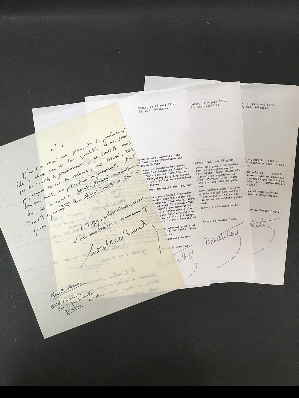 MONTHERLANT Henry de. Lotto di 3 dattiloscritti e una lettera.