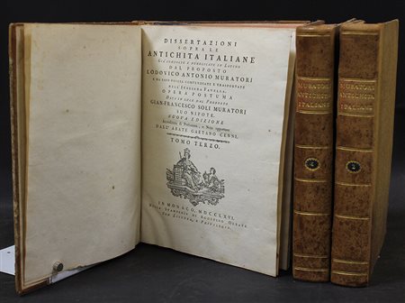 MURATORI, Lodovico Antonio. Dissertazioni sopra le antichita italiane. Monaco: Agostino Olzati, 1765. 3 volumi in 4to. Bella copia in mezza pelle coeva, tagli rossi a spruzzo, antiporte incise in rame. Non collazionato e difetti da esaminare.