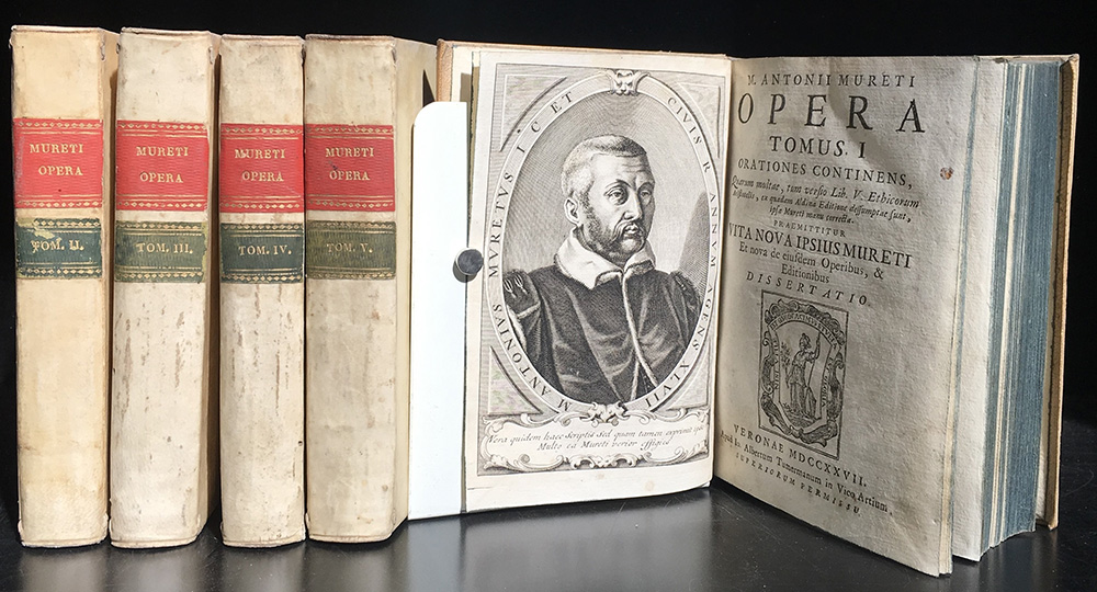 MURET M. A. Opera. Verona: Tumermanum, 1727. 8vo, 5 voll. ritratto in antiporta, legatura coeva in pina pergamena con titiolo e numerazione su tasselli al dorso, tagli blu. Non collazionato e difetti da esaminare.