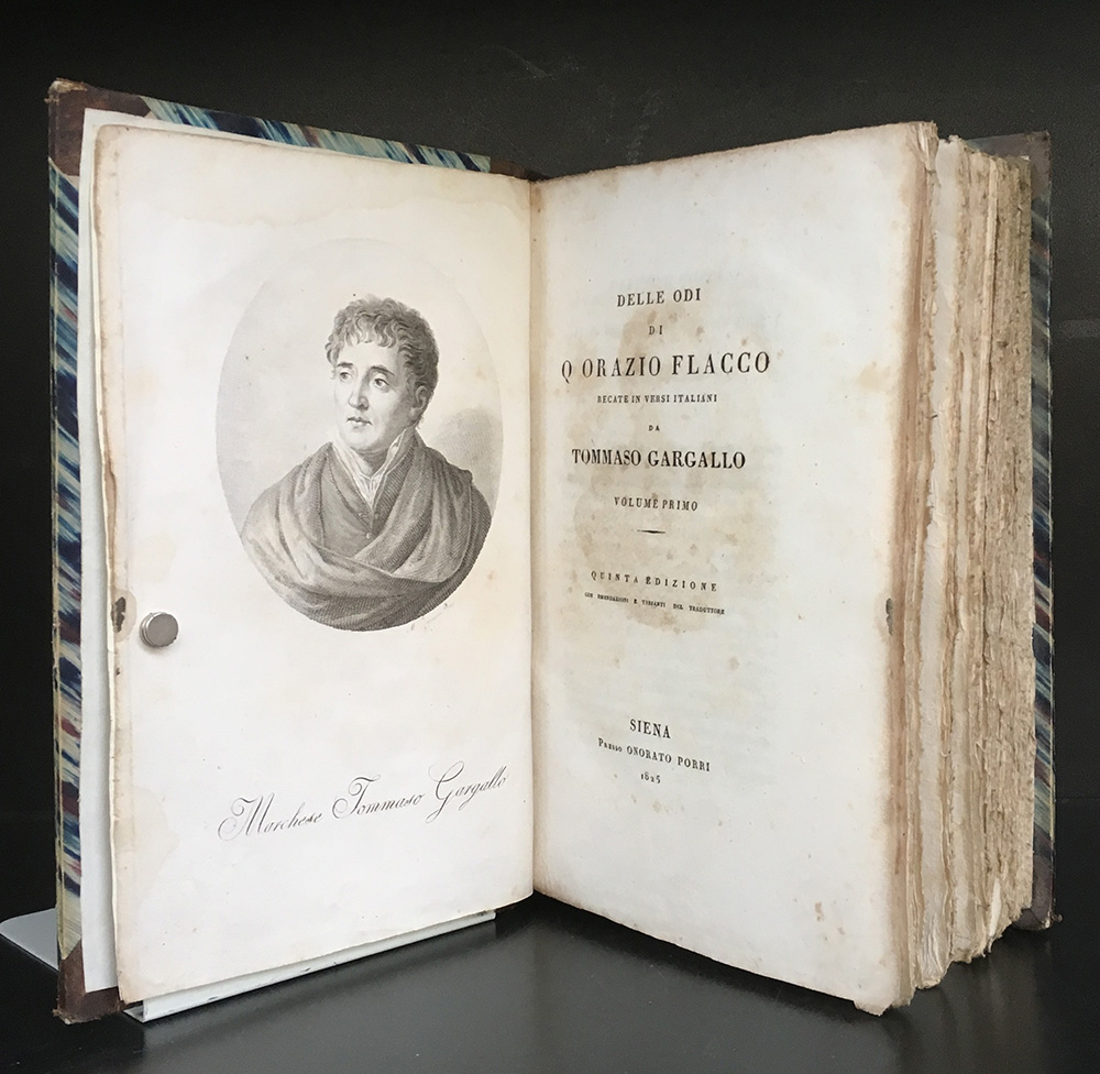 ORAZIO Delle odi di Q. Orazio Flacco. Siena: Porri, 1825. 4to, ritratto del traduttore in antiporta. Legatura coeva in mezza pelle con fregi e titolo in oro su tassello. Buona copia marginosa. Non collazionato e difetti da esaminare.