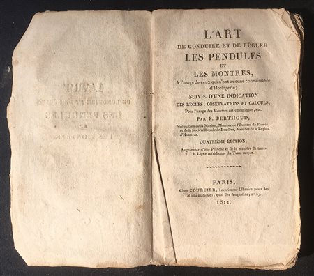 [OROLOGI] BERTHOUD, F. L'art de conduire et de regler les pendules et les montres. Parigi: Courcier, 1811. 12mo, 5 tavole più volte ripiegate. Brossura coeva (sciupata). Quarta edizioneillustrata di questo celelbre trattato per regolare gli orologi. Non collazionato e difetti da esaminare.