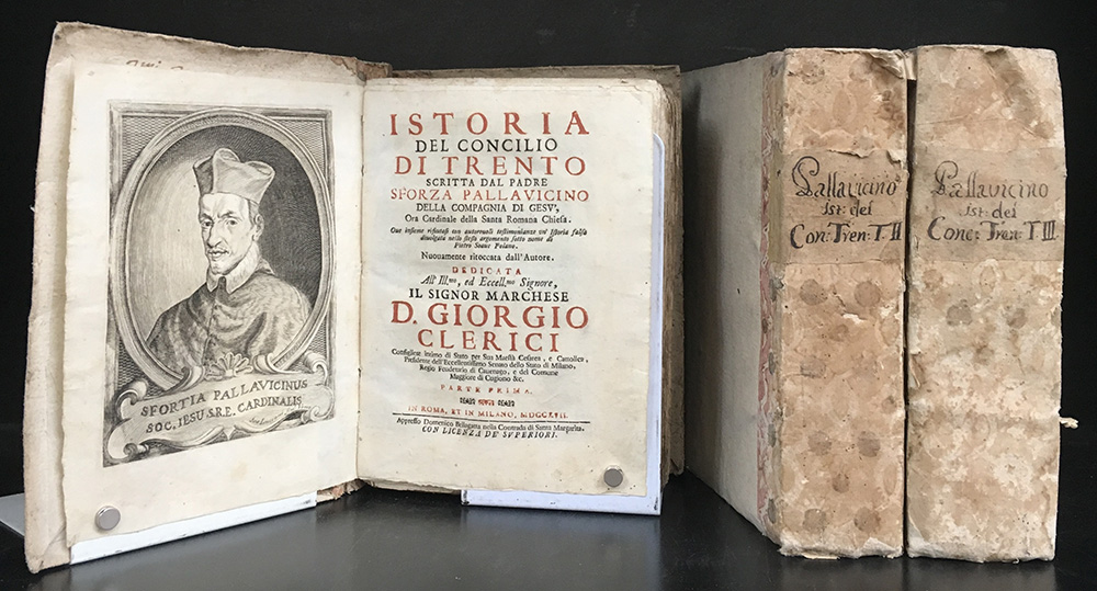 PALLAVICINO, Sforza. Istoria del Concilio di Trento. Nuovamente ritoccata dall'Autore. Milano e Roma: 1717. 3 volumi in 4to, legatura in cartone coevo con dorso in carta marmorizzata. Non collazionato e difetti da esaminare.