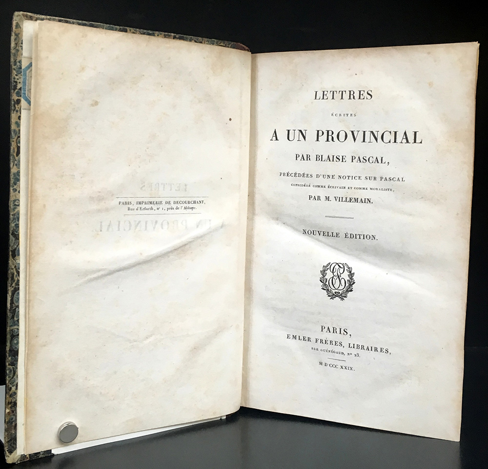 PASCAL BLAISE. Lettres écrites a un provincial, présédées d’une notice sur Pascal par M. Villemain. Parigi: Emmler, 1829. 8vo; rilegatura ell’epoca in mezza pelle. Non collazionato e difetti da esaminare.