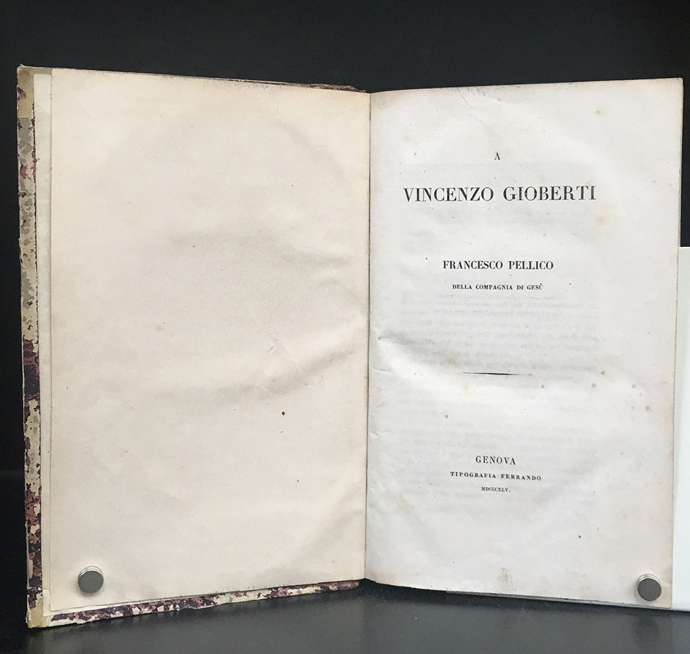 PELLICO F. A Silvio Pellico. Genova: 1845. [LEGATO CON:] CURCI Carlo M. Fatti e argomenti in risposta alle parole di Vincenzo Gioberti intorno ai gesuiti. Voghera: 1846 [E:] PARERI d’alcuni illustri contemporanei intorno alla compagnia di Gesù appendice alle apologie de’ PP. Pellico e Curci. Genova: 1846. 3 opere in un vol. in 8vo. Mezza pelle coeva. Non collazionato e difetti da esaminare.