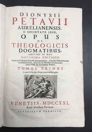 PETEAU, Dioniso. Theologicis Dogmatibus. Venezia: Aloysium Pavinum, 1721. 6 volumi in folio, frontespizio in rosso e nero. Bella copia in pergamena. Non collazionato e difetti da esaminare.