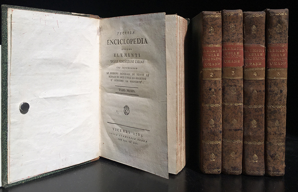 Piccola Enciclopedia ovvero elementi delle cognizioni umane. Vicenza: Stamperia Turra, 1783. 5 volumi in 8vo, dorso in pelle coeva. Non collazionato e difetti da esaminare.
