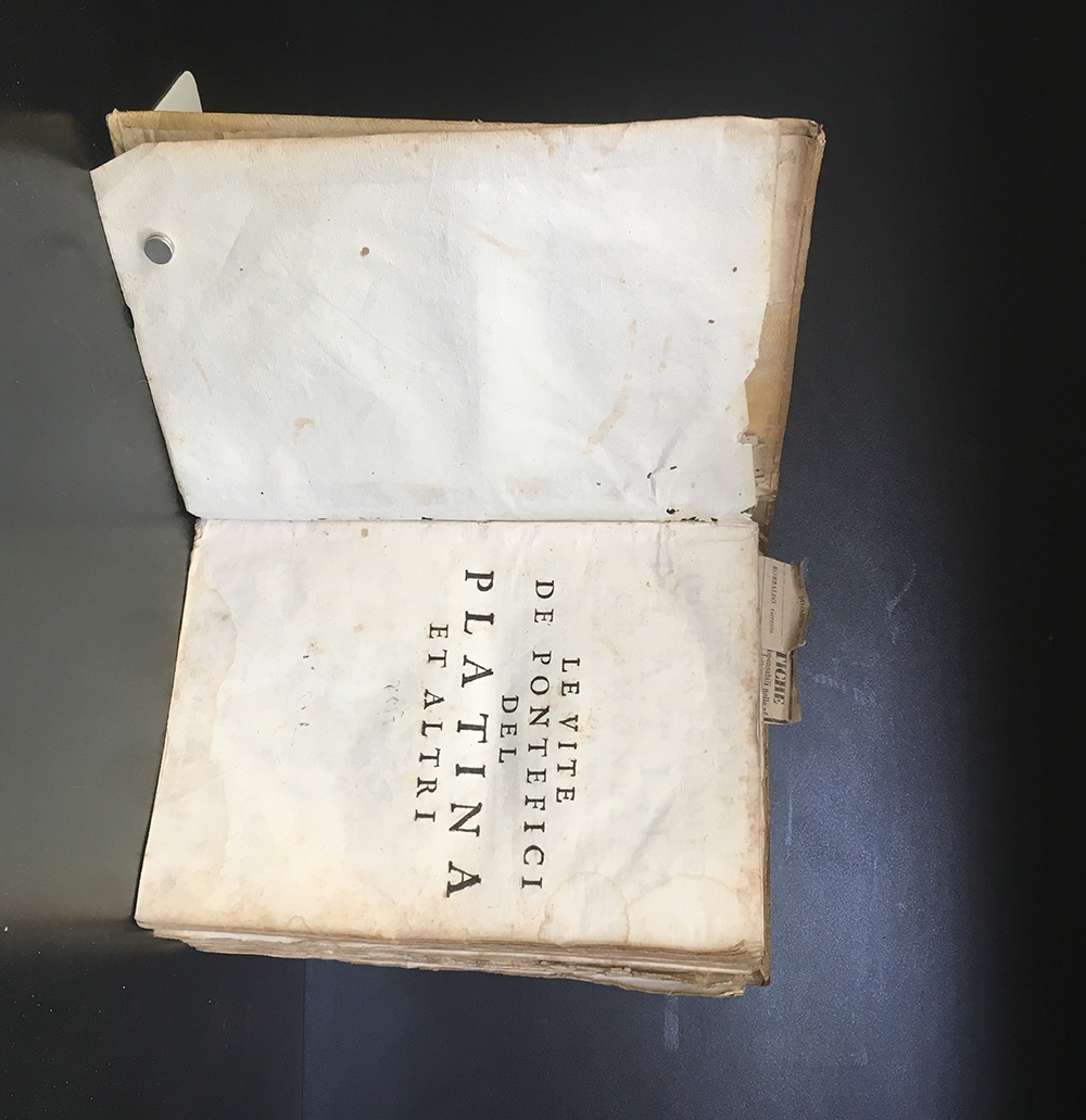 PLATINA, B. Le vite de Pontefici di Bartolomeo Platina cremonese dal Salvator nostro fino a Clemente XI. Da Onofrio Panvino, Giovanni Stringa, Antonio Cicarelli, Abramo Bzovio, Antonio Bagatta, Cav. G. Brusoni ed altri. Venezia: Monti, 1715. 4to, Numerosi ritratti e stemmi xilografici nel testo. Legatura coeva in piena pergamena. Non collazionato e difetti da esaminare.