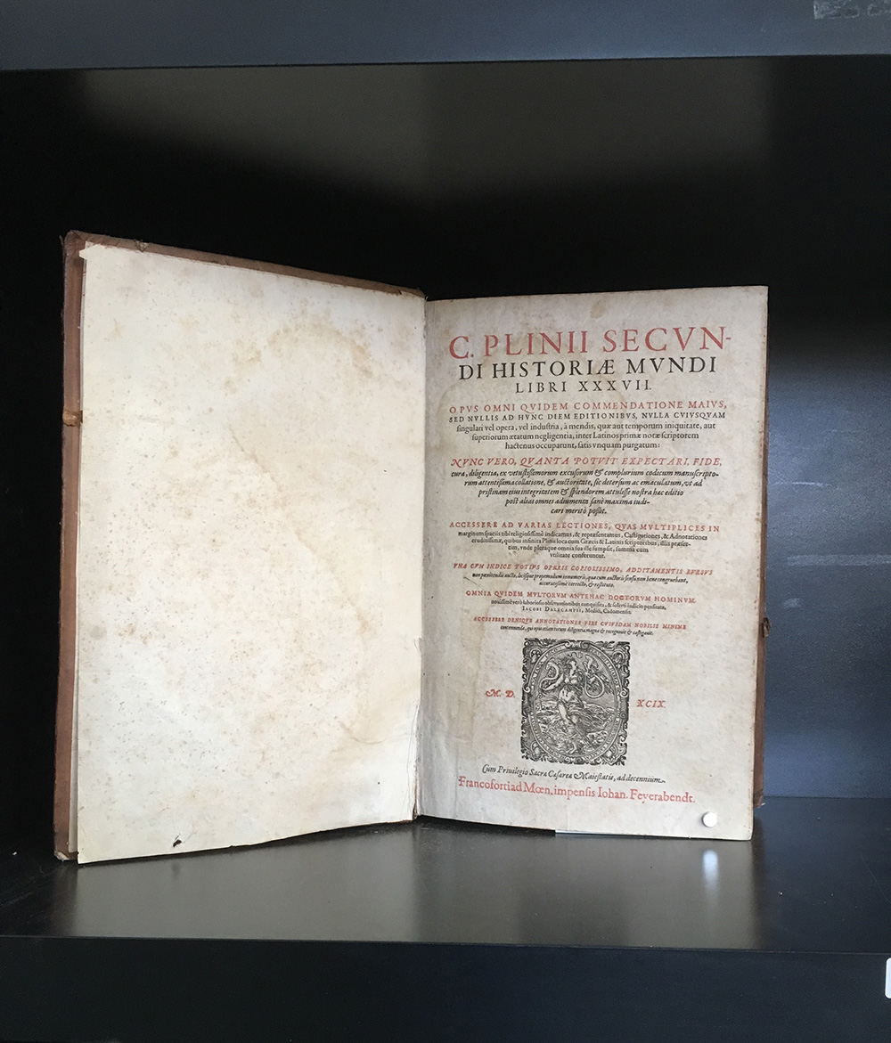 PLINIO. Historiae Mundi. Francoforte: Feyerabendt, 1599. Folio, marca tipografica al frontespizio, titolo stampato in rosso e nero. Legatura coeva in piena pelle con titiolo e decori in oro al dorso. Diffuse bruniture, legatura con difetti. Non collazionato e difetti da esaminare.