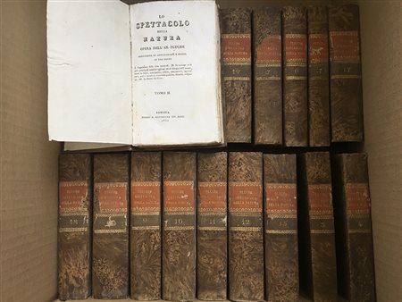 PLUCHE. Lo Spettacolo della Natura. Venezia: G. Battagia, 1831. Molti volumi della serie contenuti in un cartone. Numerosissime tavole incise in rame. Cartone coevo. Non collazionato e difetti da esaminare.