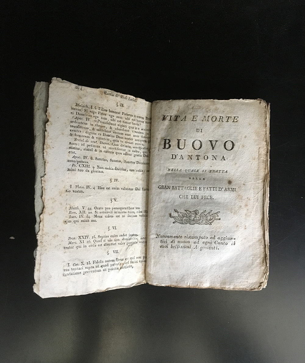 [POEMI CAVALLERESCHI] Vita e morte di Buovo d'Antona. Milano: Agnelli[?] c.a 1815-20. 12mo, brossura pubblicitaria coeva. Raro poema cavalleresco dedicato a Buovo d'Antona, discendente di Costantino e antento del celebre Guerino il Meschino. Non collazionato e difetti da esaminare.