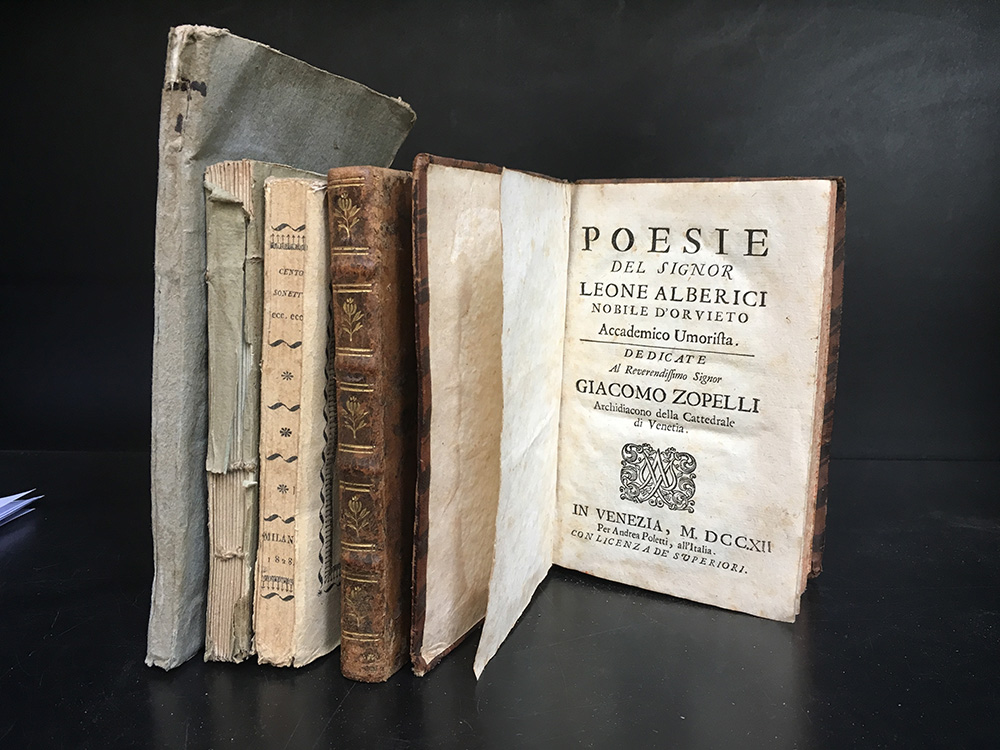 [POESIA] Lotto di 5 opere di poesia in legature coeve: ALBERICI L. Poesie. Venezia, Poletti, 1712. 8vo, legatura coeva in pelle, decori e titolo in oro al dorso;FRUGONI C. Canzonette anacreontiche. Milano: Mazzucchelli, 1766. 8vo, legatura coeva in piena pelle con decori in oro al dorso; Poesie varie di Labindo. Livorno: Giorgi, 1792. brossura coeva; PARINI, Il mattino, il mezzogiorno e la sera. Venezia: Savioni, 1779. brossura coeva; CESAROTTI M. Cento sonetti. Milano: Schieppati, 1828. 16mo, brossura editoriale stampata, tavola in antiporta. Non collazionato e difetti da esaminare.
