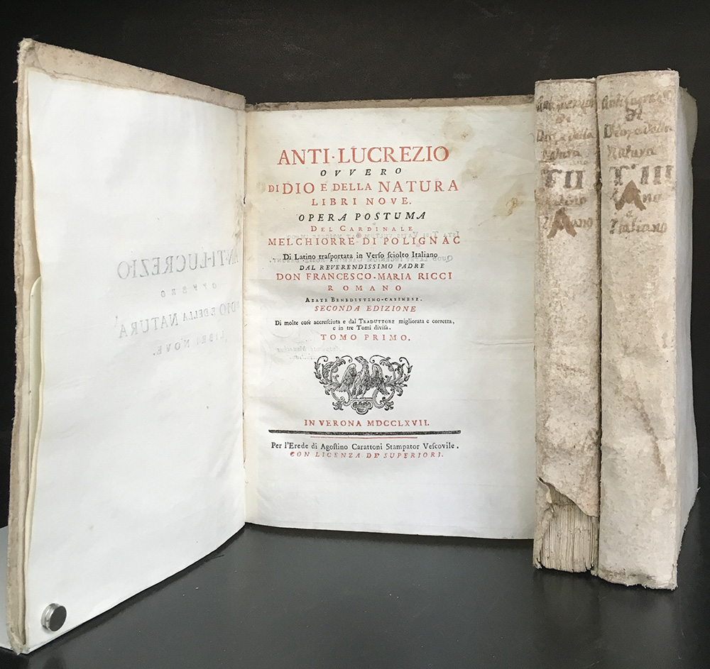 POLIGNAC, Melchior de. Anti-Lucrezio ovvero di Dio e della Natura libri nove. Verona: Erede di Agostino Carattoni, 1767. 3 volumi in 4to, cartone coevo. Non collazionato e difetti da esaminare.