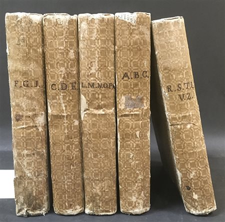 RIPA C. Iconologia… notevolmente accresciuta dall’Abate Cesare Orlandi. Perugia: Costantini, 1764-1767. 4to 5 voll. ritratto in antiporta, numerose incisioni nel testo. Legatura coeva in cartonato. Tra i più ampi repertori di simboli ad uso di pittori, scultori, poeti. Non collazionato e difetti da esaminare.