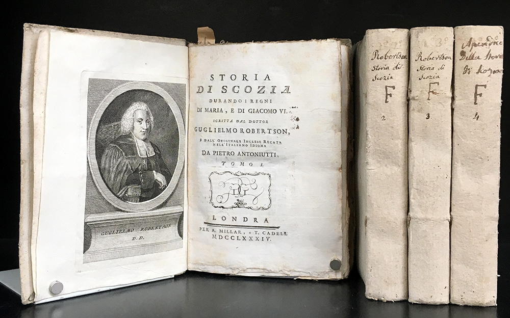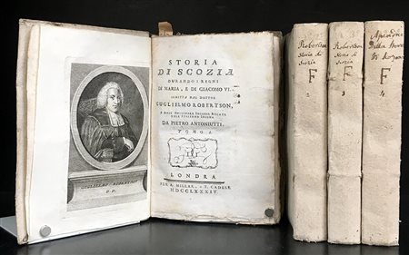 ROBERTSON, William. Storia di Scozia durando i regni di Maria e di Giacomo VI. Londra: A. Millar e T. Cadell, 1784. 34 volumi in 8vo, bel ritratto in antiporta, vignetta incisa in rame al frontespizio. Cartone coevo. Non collazionato e difetti da esaminare.