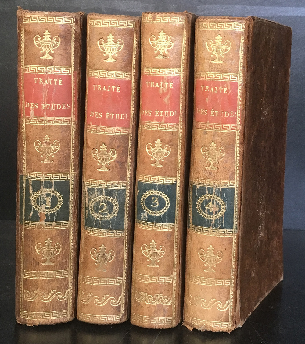 ROLLIN, Charles. De la Maniere d'enseigner et d'etudier les belles-lettres. Avignone: Seguin e Le Normat, 1808. 4 volumi, 8vo. Pelle coeva, dorsi con bei decori in oro. Bella copia. Non collazionato e difetti da esaminare.