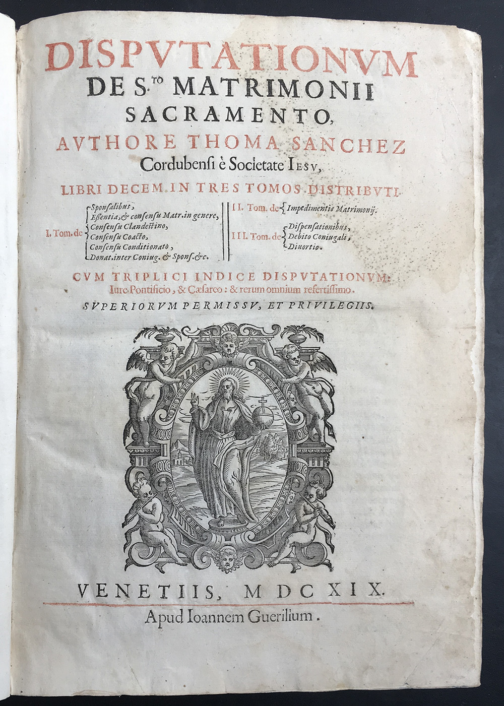SANCHEZ Toma (1550-1610). Disputationum de Sancto Matrimonii Sacrameneto. Libri decem. Venezia: Ioannem Guerilium, 1619-1606. 2 volumi in folio, frontespizi in rosso e nero con grande xilografia, pergamena coeva, tagli marmorizzati con titolo al taglio inferiore. Bella copia. Non collazionato e difetti da esaminare.