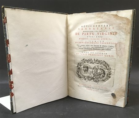 SANNAZARO I. De Partu Virginis libri tres . Firenze: Albizini, 1740. 4to, vignetta al frontespizio, capilettera incisi, 2 tavole ripiegate. Legatura del XIX secolo con dorso in pelle e titolo in oro. Non collazionato e difetti da esaminare.