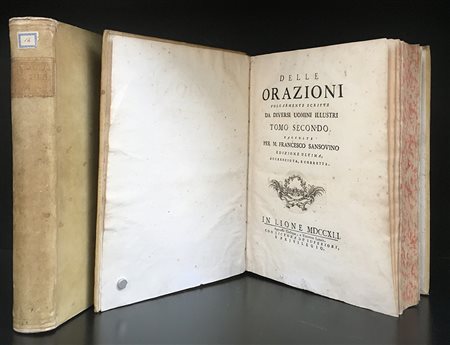 SANSOVINO, Francesco. Delle orazioni volgarmente scritte da diversi uomini illustri. Lione: 1741. 2 volumi in 4to. Pergamena coeva, tagli a spruzzo. Bella copia. Non collazionato e difetti da esaminare.