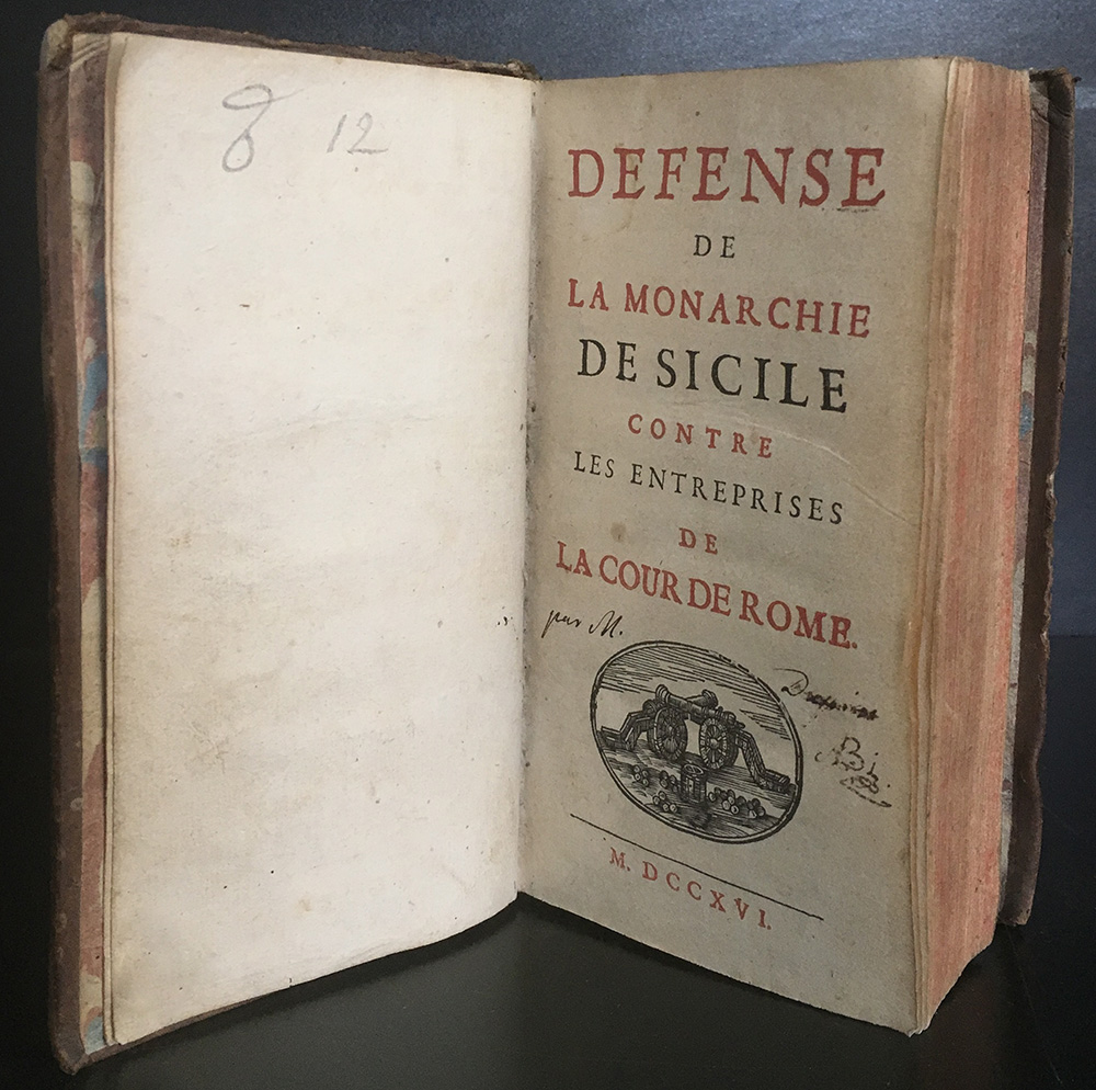 [SAVOIA] DUPIN Louis Ellies. Defense de la Monarchie de Sicile contre les entreprises de la Cour de Rome. S.l. [Amsterdam], s.d., 1716. 12mo, vignetta al frontespizio. Legatura coeva in piena pelle con titoli e decori in oro al dorso. Opera che difende il titolo dei Savoia di re di Sicilia contro le accuse mosse dalla corte Pontificia. Vittorio Emanuele II fu re di Sicilia dal 1713 al 1720 a seguito del trattato di Utrecht ma dovette cedere l'isola, in cambio della Sardegna, ai Borbone con il trattato dell'Aia. Non collazionato e difetti da esaminare.