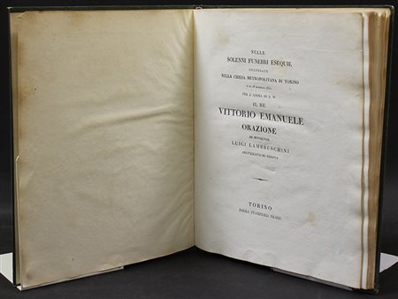 [SAVOIA] LAMBRUSCHINI, Luigi. Nelle solenni funebri esequie celebrate nella chiesa metropolitana di Torino per l'anima di S.M. Il Re Vittorio Emanuele. Torino: Stamperia Reale, s.d. Folio, bella legatura in marocchino verde coevo. Non collazionato e difetti da esaminare.
