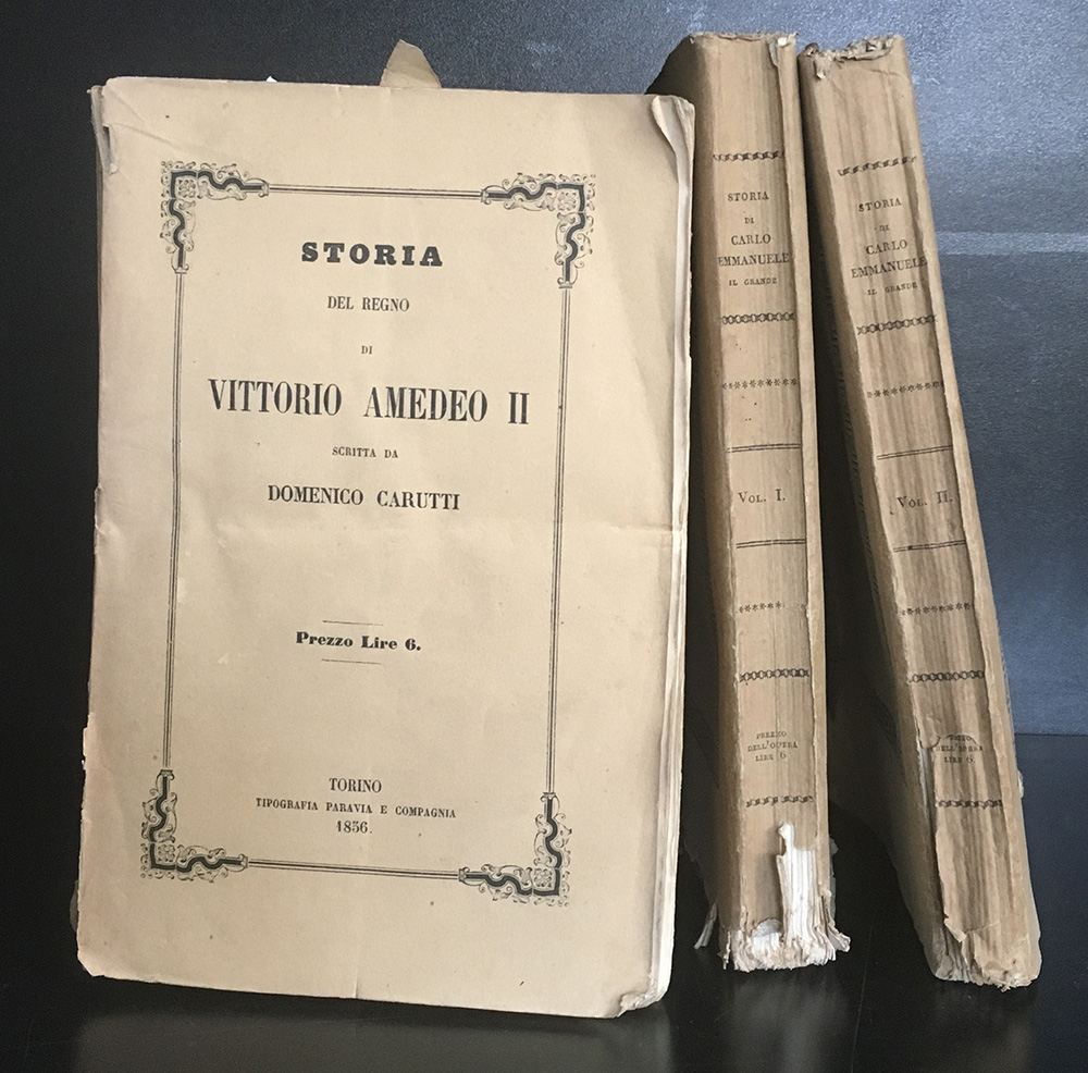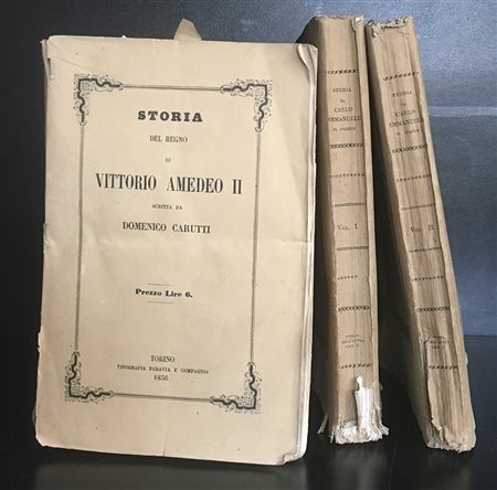 [SAVOIA] Lotto composto da: SEMERIA G.B. Storia del re di Sardegna Carlo Emmanuele il Grande. Torino: Reale Tipografia, 1831. 8vo, 2 voll. Ritratto in antiporta. Brossura editoriale stampata; CARUTTI D. Storia del regno di Vittorio Amedeo II. Torino: Paravia, 1856. 8vo, brossura editoriale stampata. Non collazionato e difetti da esaminare.