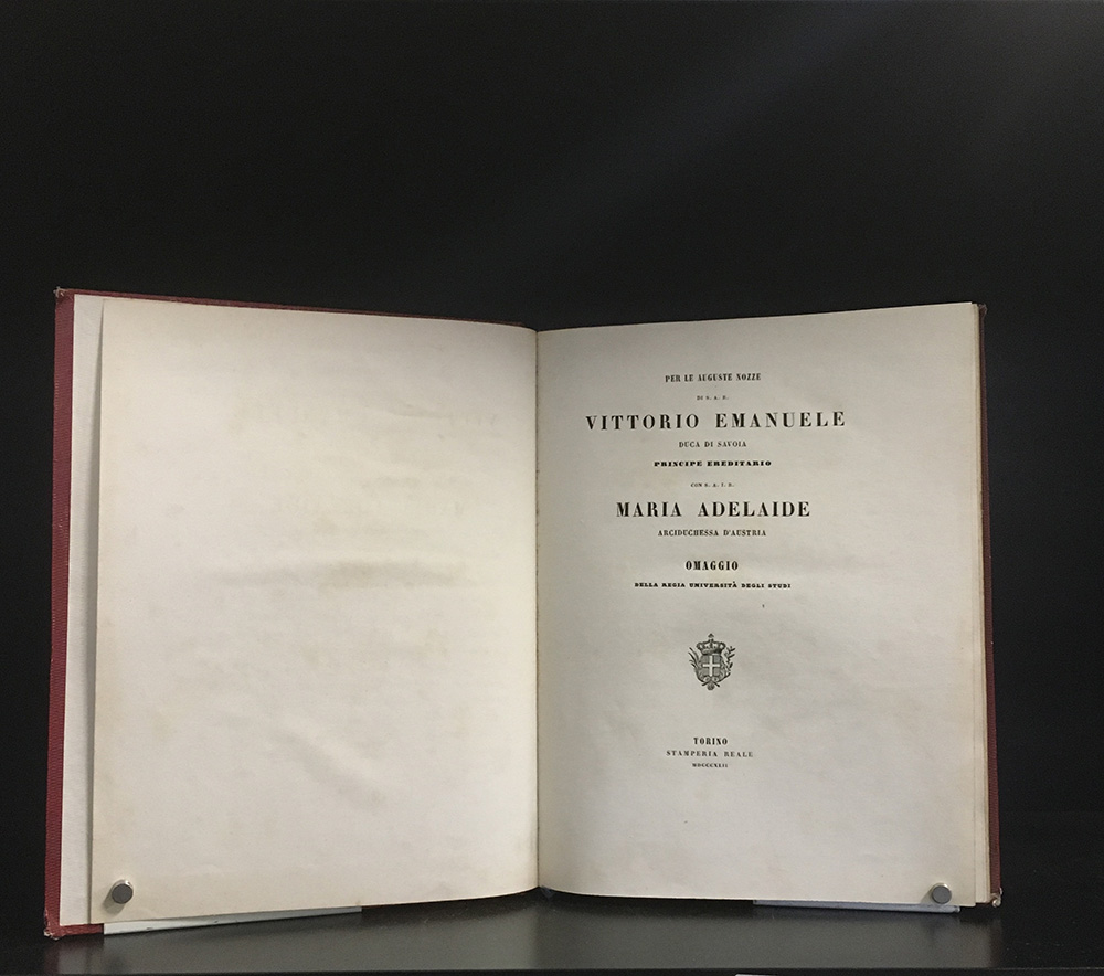 [SAVOIA] Per le Auguste Nozze di S.A.R. Vittorio Emanuele Duca di Savoia con S.A.I.R. Maria Adelaide. Torino: Stamperia Reale, 1842. In cinese, sanscrito, latino e italiano. Mezza pelle rossa coeva, piatti con bordi decorati in oro. Buone condizioni. Non collazionato e difetti da esaminare.
