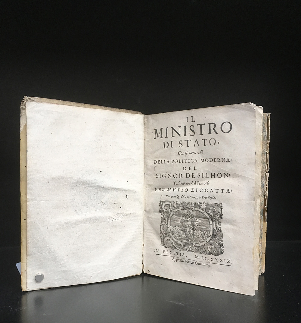 SILHON, Jean de. Il Ministro di Stato. Venezia: Marco Ginammi, 1639. 4to, iniziali xilografiche, errata in fine. Buona copia in pergamena coeva, tagli a spruzzo. Non collazionato e difetti da esaminare.