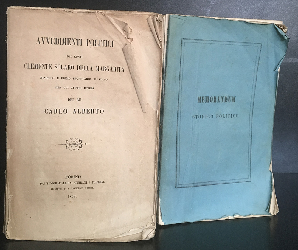 SOLARO DELLA MARGARITA C. Memorandum storico politico. Torino: Speirani e Tortone, 1851. 4to brossura editoriale coeva stampata; SI AGGIUNGE: Avvedimenti politici. Torino: Speirani e Tortone, 1853. 4to brossura editoriale coeva stampata. Le due memorie del primo ministro degli stati sabaudi Solaro della Margarita, reazionario, inviso ai liberali e osteggiatore dello stato unitario. Non collazionato e difetti da esaminare.