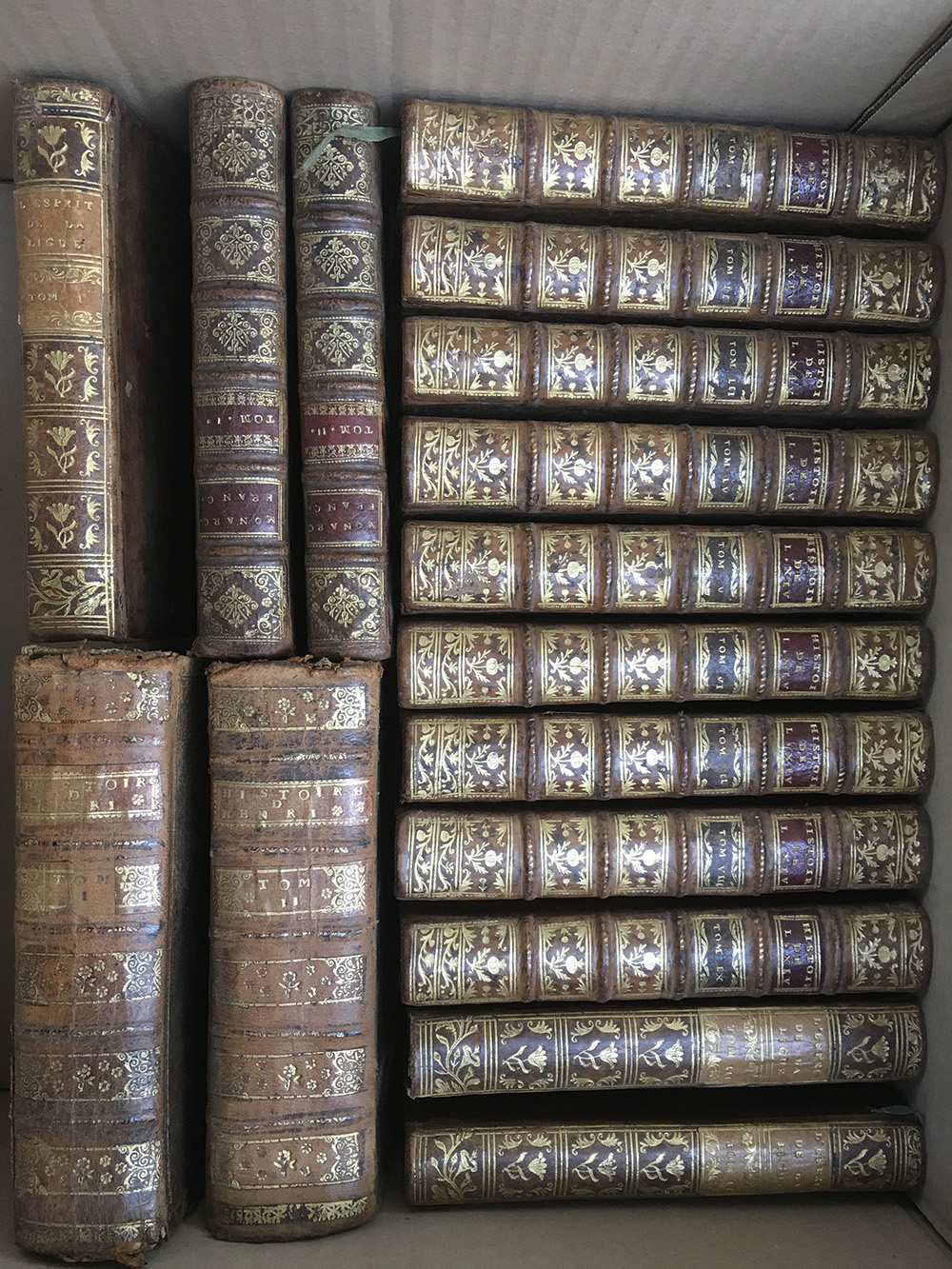 [STORIA FRANCESE] Lotto di opere relative alla storia francese: REBOULET, S. Histoire du regne de Louis XIV. Amsterdam: Chastelain, 1756. 12mo, 9 vol. ANQUETIL P. L. P. l'Esprit de la Ligue, ou histoire politique des troubles de la Ligue pendant les XVI et XVII siècles. Parigi: Horissant, 1770. 12mo 3 voll. Legatura coeva in vitello con titioli e decori in oro al dorso; Histoire de la monarchie francoise sous le regne de louis le grand. Parigi: Cavelier, 1697. 12mo, 2 voll. Legatura coeva in piena pelle con titolo e decori in oro al dorso. Non collazionato e difetti da esaminare.