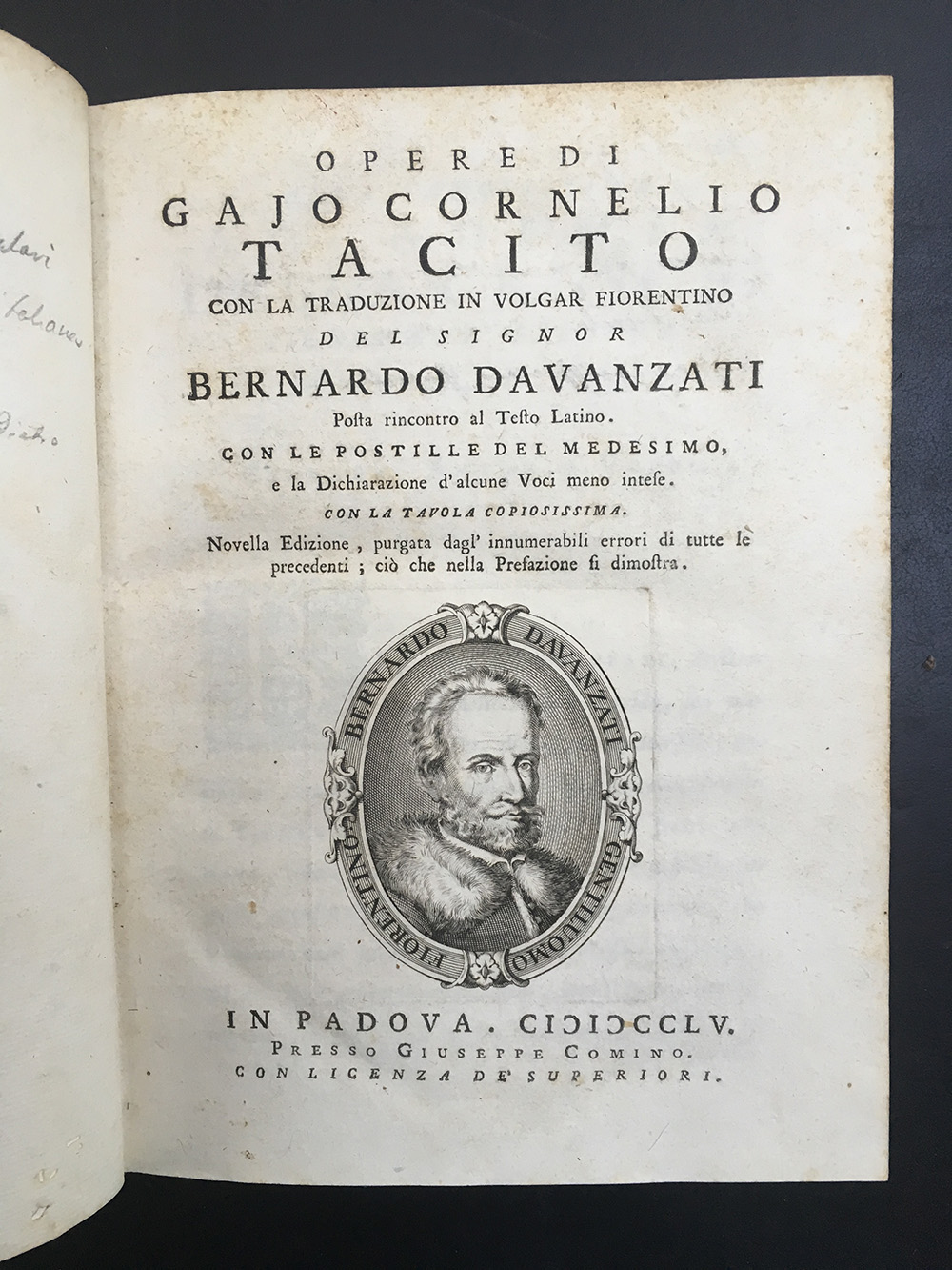 TACITO-DAVANZATI. Opere con la traduzione in volgar fiorentino del signor Bernardo Davanzati. Padova: Giuseppe Comino, 1755. 4to, ritratto dell'autore inciso in rame al frontespizio, pelle verde del XIX secolo, tagli a spruzzo blu. Non collazionato e difetti da esaminare.