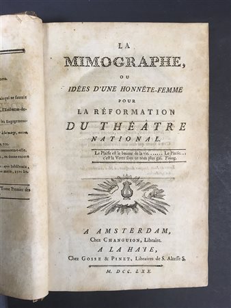 [TEATRO] RESTIF DE LA BRETONNE. La Mimographe, ou idèes d’une honnete-femme pour la reforamtion du theatre national. Amsterdam, Changuion, 1770. 8vo, bruniture e fioriture. Legatura coeva con dorso in pelle, decori in oro e titolo su tassello (lievi difetti). Interessante e rara opera che discutendo della riforma del teatro getta luce sul teatro popolare del XVIII secolo. Non collazionato e difetti da esaminare.