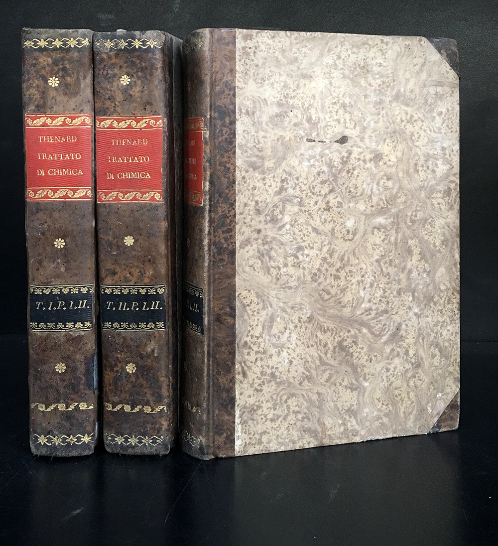THENARD, Louis Jacques Thenard. Trattato di chimica elementare teorica e pratica. Firenze: Stamperia Guglielmo Piatti, 1818-19. 6 parti in 3 volumi, 8vo, mezza pelle coeva, dorsi decorati in oro con etichette rosse e nere. Non collazionato e difetti da esaminare.