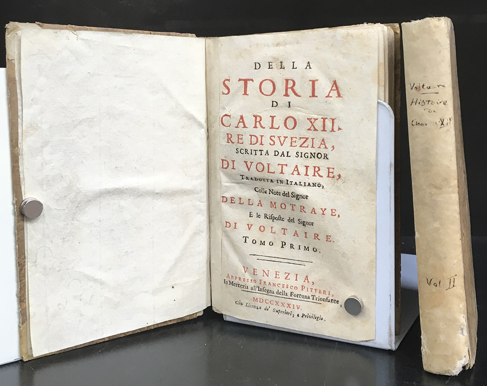 VOLTAIRE. Della storia di Carlo XII re di Svezia scritta dal signor di Voltaire. Venezia: Francesco Pitteri, 1734. 2 volumi, frontespizio in rosso e nero, mezza pergamena coeva. Non collazionato e difetti da esaminare.