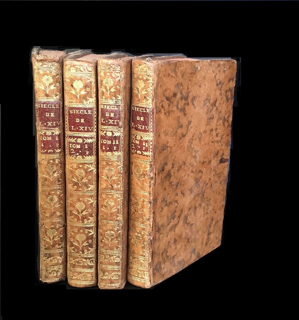 VOLTAIRE. Le Siecle de Louis XIV. Publie par M. de Francheville. Lipsia: s.e, 1754. 12mo, 4 voll. Legatura coeva in vitello con titioli e decori in oro al dorso tagli rossi. Terza edizione della celebre opera sul fine delle politiche dei regnanti. Non collazionato e difetti da esaminare.
