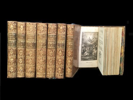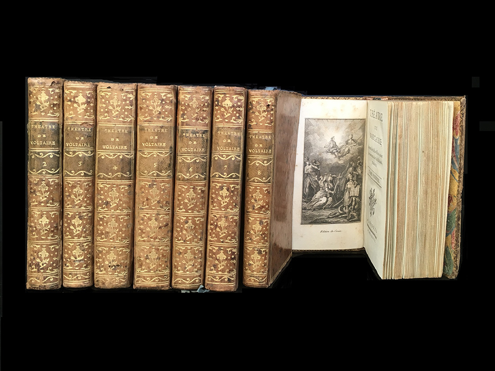 VOLTAIRE. Théatre de Voltaire. Londra: [Cazin], 1782. 16mo, 8 voll, antiporta figurata. Rilegatura in vitellino con decori e titoli in oro su tassello al dorso, profili in oro ai piatti e ai contropiatti, tagli dorati, segnalibri in seta. Elegante edizione dell'opera teatrale di Voltaire. Non collazionato e difetti da esaminare.