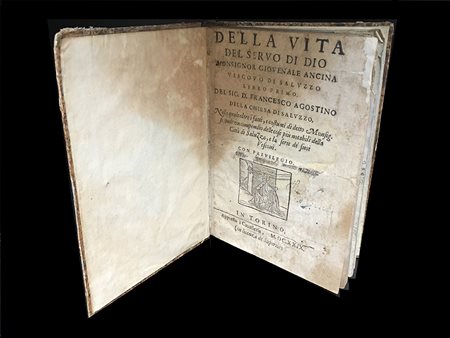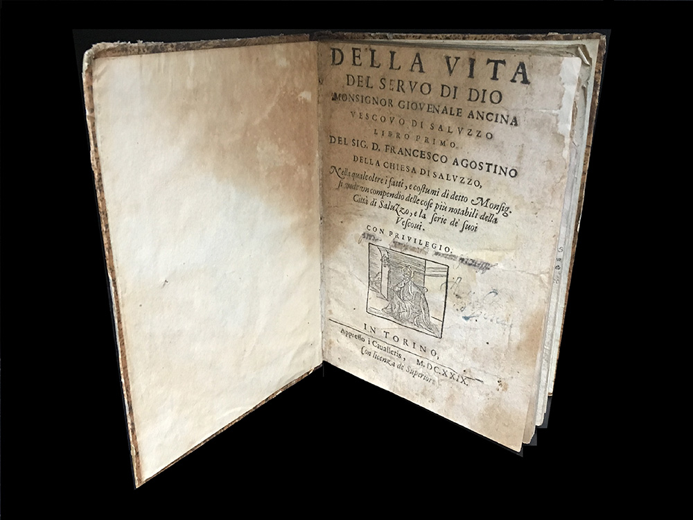 [PIEMONTE] DELLA CHIESA F. Della vita del servo di dio monsignor Giovenale Ancina vescovo di Saluzzo. Torino: Cavalleris, 1629. 4to, legatura del XIX secolo con dorso in pelle. Raro volume sulla storia di Saluzzo. Non collazionato e difetti da esaminare.