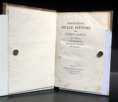 [PISA] ROSINI, Giovanni. Descrizione delle pitture del Campo Santo di Pisa coll'indicazione dei monumenti ivi raccolti. Pisa: Niccolò Capurro co' caratteri di Didot, 1816. 8vo, numerose tavole. Legatura coeva con dorso in tela. Non collazionato e difetti da esaminare.