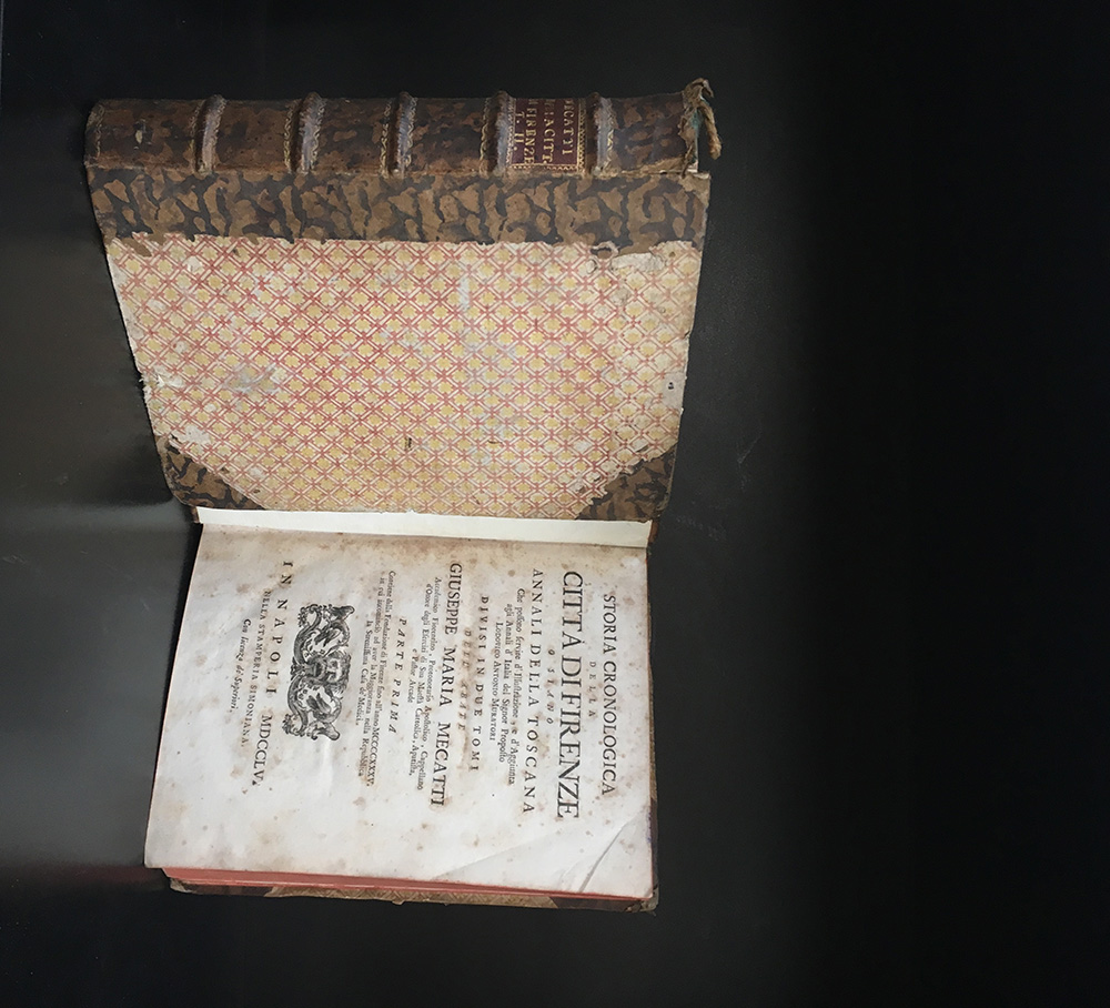 [TOSCANA] MECATTI, G. M. Storia cronologica della città di Firenze o siano Annali della Toscana. Napoli: Di Simone, 1755. 4to, 2 voll. fregi xilografici al frontespizio. Legatura coeva in mezza pelle con titolo in oro su tassello bordeaux al dorso, tagli rossi. Annali di storia toscana che nelle intenzioni dell'autore dovevano arricchire l'opera di Muratori. Non collazionato e difetti da esaminare.