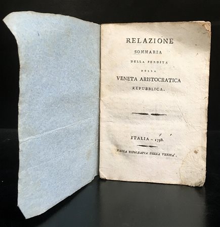 [VENEZIA] AGDOLLO F. Relazione sommaria della perdita della veneta aristocratica repubblica. Italia: Tipografia della Verità, 1798. 8vo, brossura coeva. Accusa mossa da ambienti conservatori ai magistrati della repubblica veneta accusati di aver venduto la nazione ai francesi. Non collazionato e difetti da esaminare.